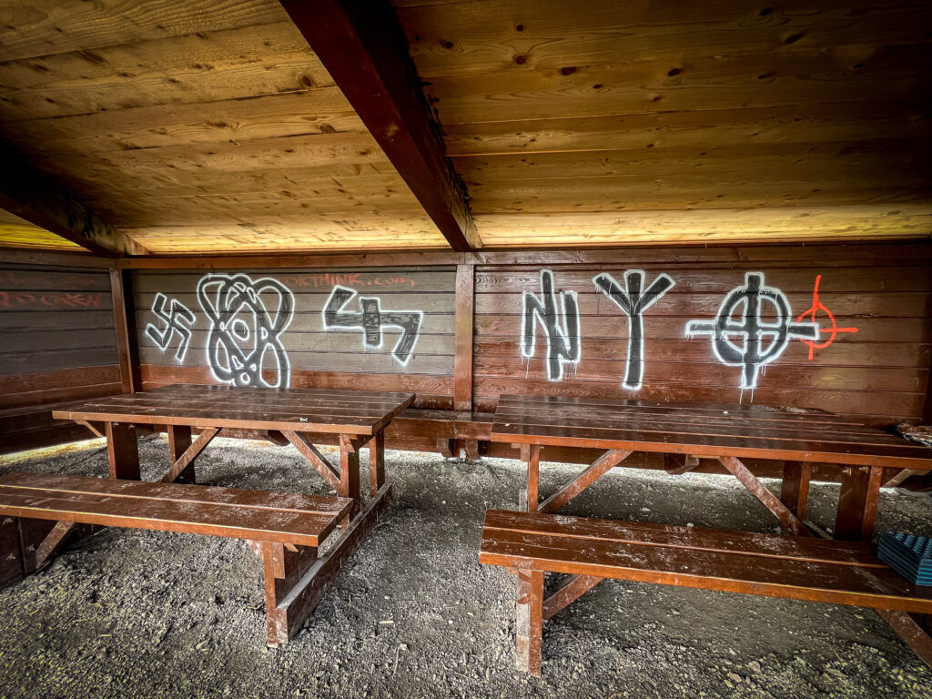 Det var et trist syn som møtte oss i aktivitetsparken nylig. Gapahuken og grillen har blitt utsatt for tagging, og fremstår nå langt fra slik de skal være for alle