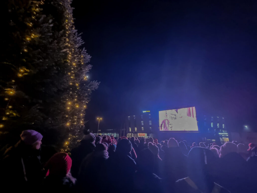 Vintermørket skaper en god ramme, og sammen med varmen fra bålpannene oglyset fra julegranene setter det stemningen for julefilmen som vises på storskjerm.