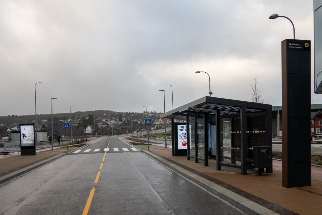 Den midlertidige løsningen i Senerommet erstattes snart med busskur. Rogaland fylkeskommune informerer: Starter å etablere busskur ved Skråtårnet og Hinnasvingene I løpet av uke 44/45 starter vi å montere permanente
